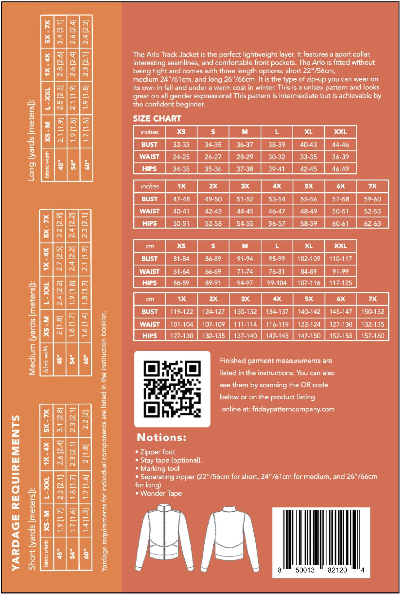 The Arlo Track Jacket is the perfect lightweight layer. It features a sport collar, interesting seamlines, and comfortable front pockets. The Arlo is fitted without being tight and comes with three length options: short 22”/56cm, medium 24”/61cm, and long 26”/66cm. It is the type of zip-up you can wear on its own in fall and under a warm coat in winter. This is a unisex pattern and looks great on all gender expressions! This pattern is intermediate but is achievable by the confident beginner.
