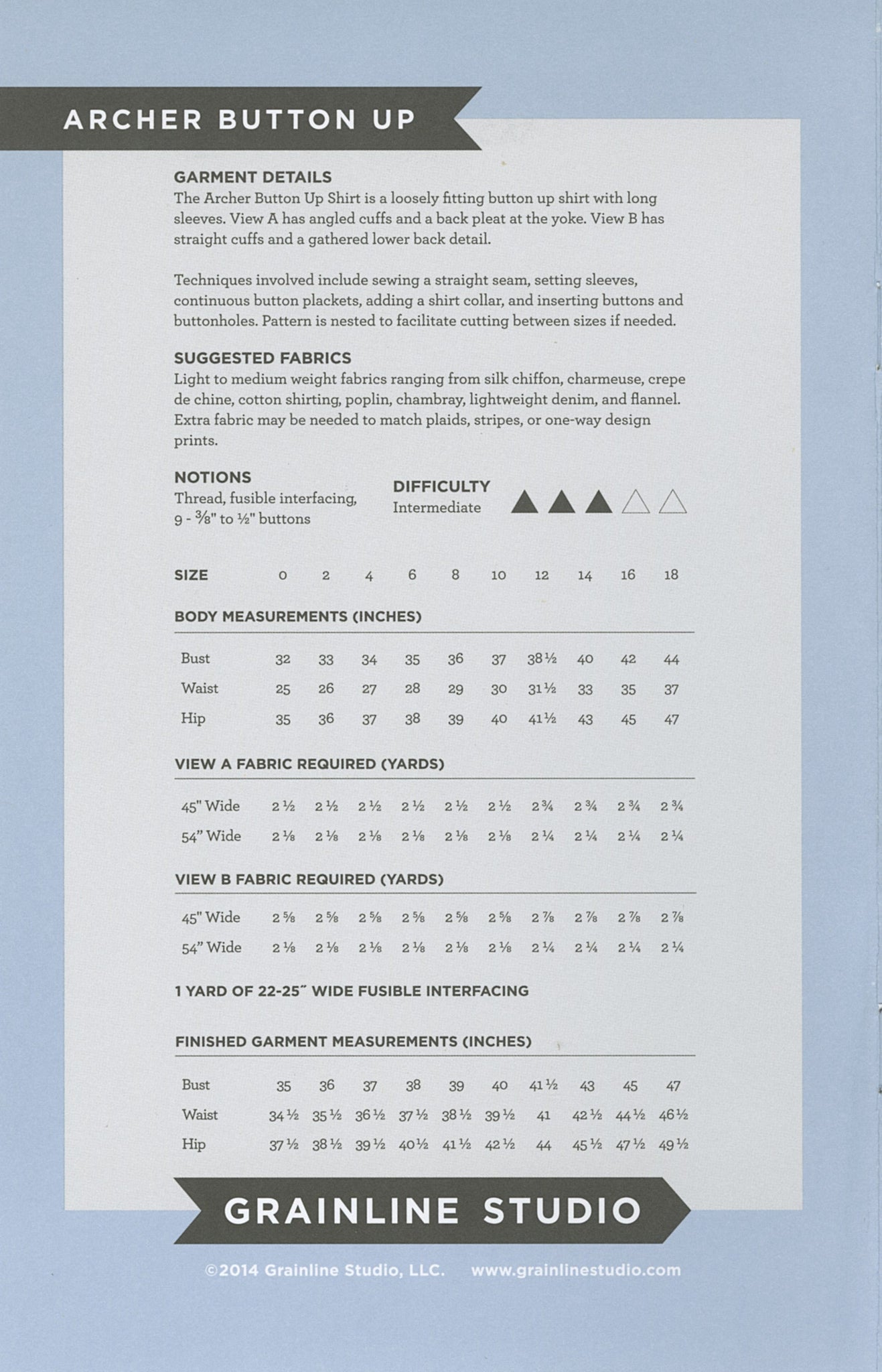 The Archer Button Up is a loosely fitting button up shirt with long sleeves. View A has angled cuffs and a back pleat at yoke. View B has straight cuffs and a gathered lower back detail. Techniques involved include sewing a straight seam, setting sleeves, continuous button plackets, adding a shirt collar and buttons & buttonholes. Pattern is nested to facilitate cutting between sizes if needed. SUGGESTED FABRICS Shirt weight fabrics ranging from silk chiffon, silk crepe de chine, cotton shirting, chambray, lightweight denim, and flannel.