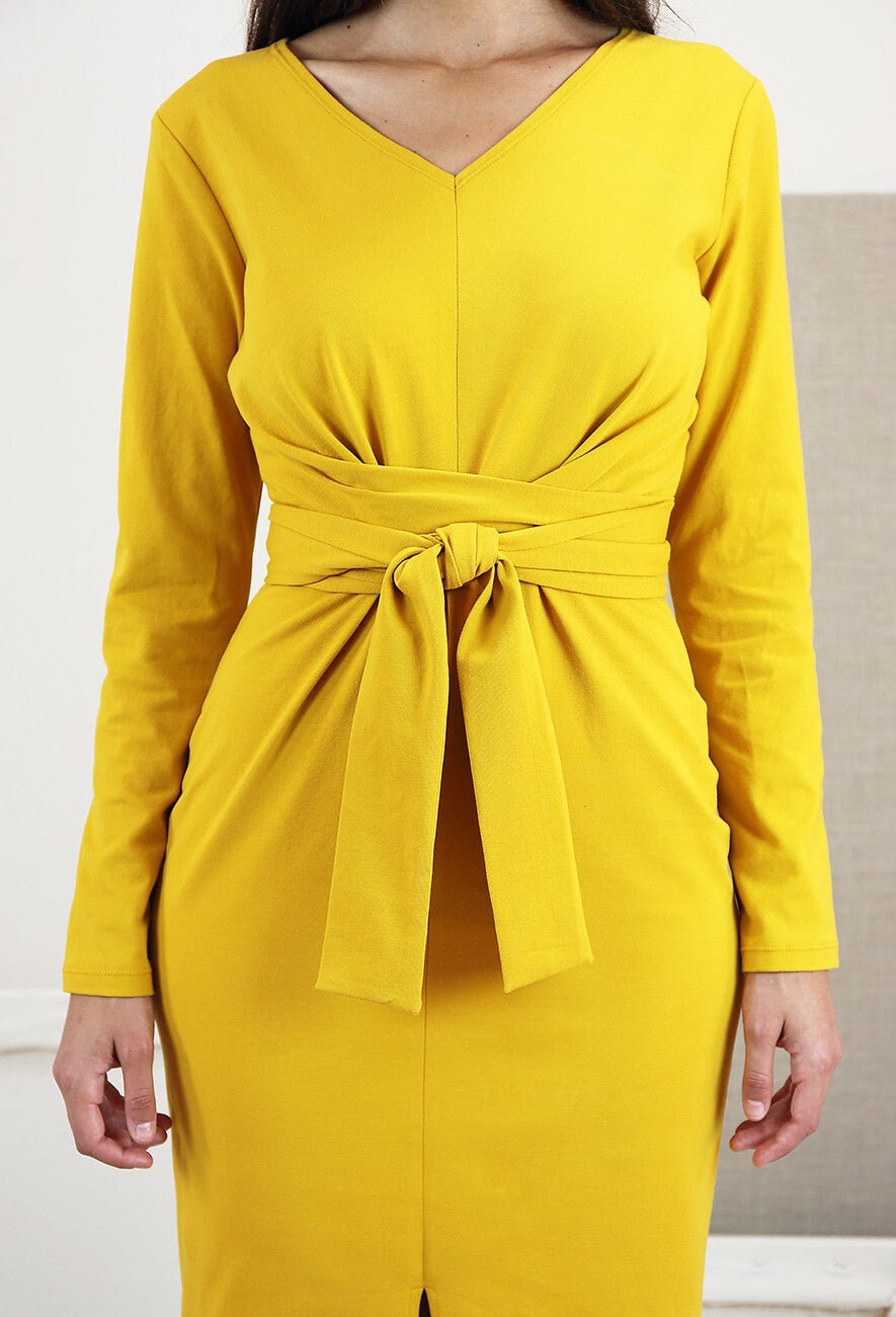 This elegant knit dress features an interesting and deceptively uncomplicated wrap detail as well as a simple set-in sleeve, a very easy-to-sew V neck, and a front-slit skirt. The dress comes together quickly and is extremely comfortable to wear. View A includes a short cap sleeve and front ties while View B features long sleeves and longer ties that wrap around the body before tying in front. This dress can be sewn from ponte for an office-worthy or cocktail dress or from jersey or French terry for a more casual everyday dress.