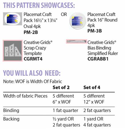 Whether you choose a round or oval version, these placemats go together in a matter of just a few hours. Each placemat requires just 4 blocks created with the Creative Grids Scrap Crazy set (CGRMT4).