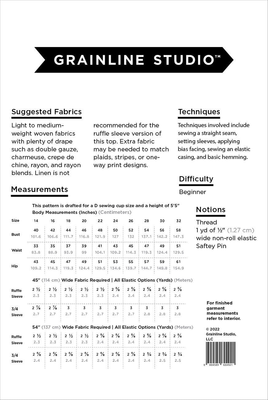 The Corin is a drapey drop shoulder top with a wide round neckline. The pattern includes two sleeve options – a ruffled cap sleeve and a straight 3/4 length sleeve. An optional gathered elastic detail at the front and back waist adds interest and shaping. While we have sewn up three views of the pattern, the sleeves and elastic can be combined in any configuration to create 6 different options. Techniques involved include sewing a straight seam, setting sleeves, applying bias facing, sewing an elastic casing, and basic hemming.