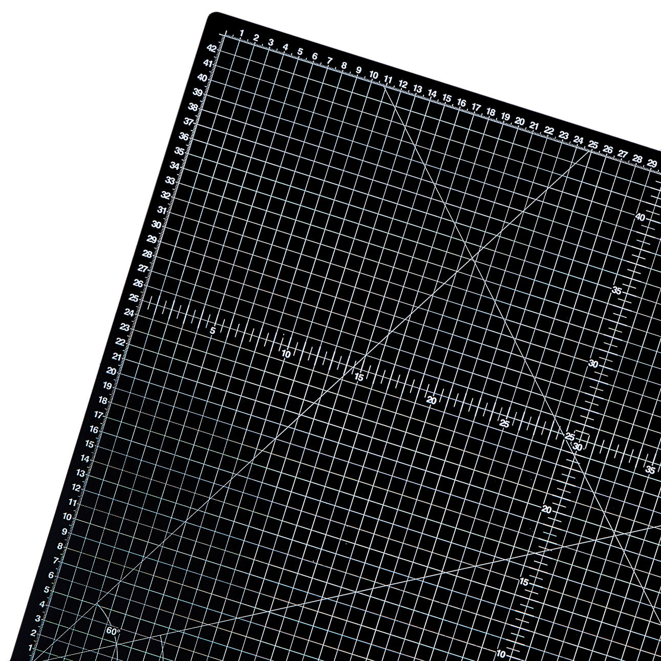 Double-sided, bi-coloured cutting mat. 3mm thick with self-healing, non-slip surface. Designed for professional use with rotary cutter. Imperial (grey side) and metric (black side) measurements. Easy to read measurements in white with 30, 45, 60 and 90 degree angles lines.