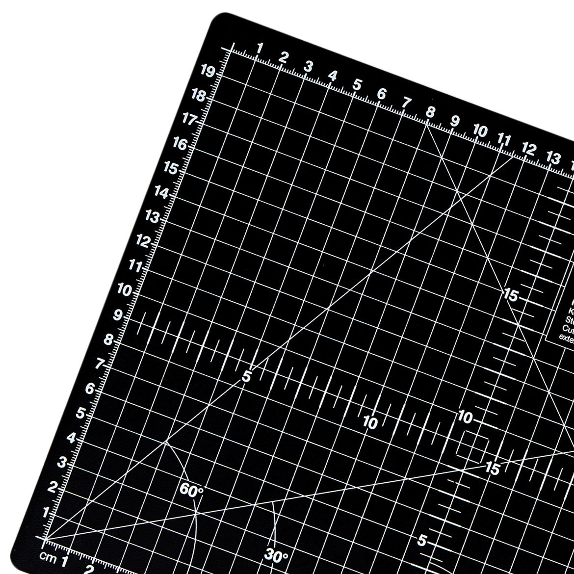 Double-sided, bi-coloured cutting mat. 3mm thick with self-healing, non-slip surface. Designed for professional use with rotary cutter. Imperial (grey side) and metric (black side) measurements. Easy to read measurements in white with 30, 45, 60 and 90 degree angles lines. Grid size: 280 x 200mm (11 x 9in.)