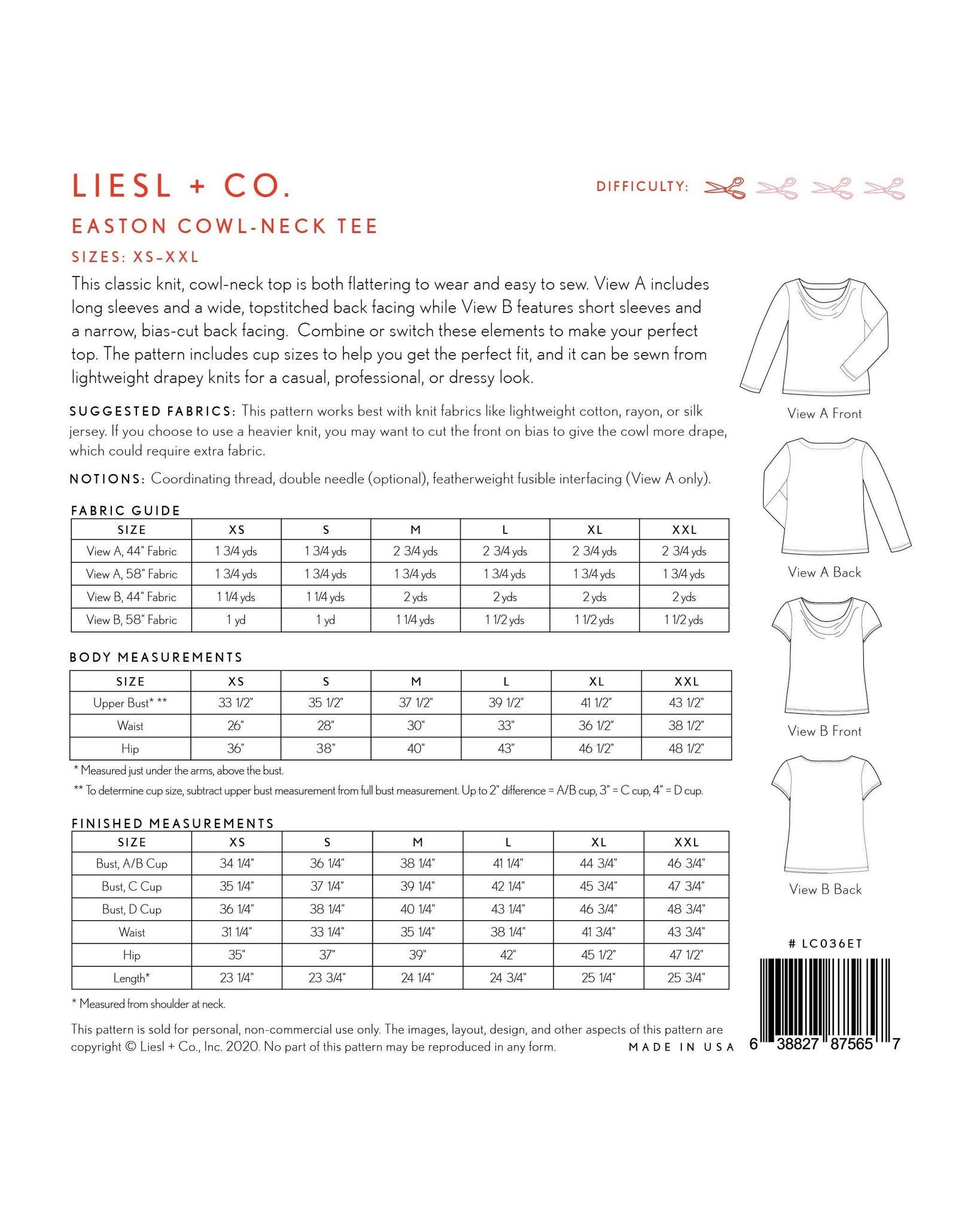 This classic knit, cowl-neck top is both flattering to wear and easy to sew. View A includes long sleeves and a wide, topstitched back facing while View B features short sleeves and a narrow, bias-cut back facing. Combine or switch these elements to make your perfect top. The pattern includes cup sizes to help you get the perfect fit, and it can be sewn from lightweight drapey knits for a casual, professional, or dressy look.