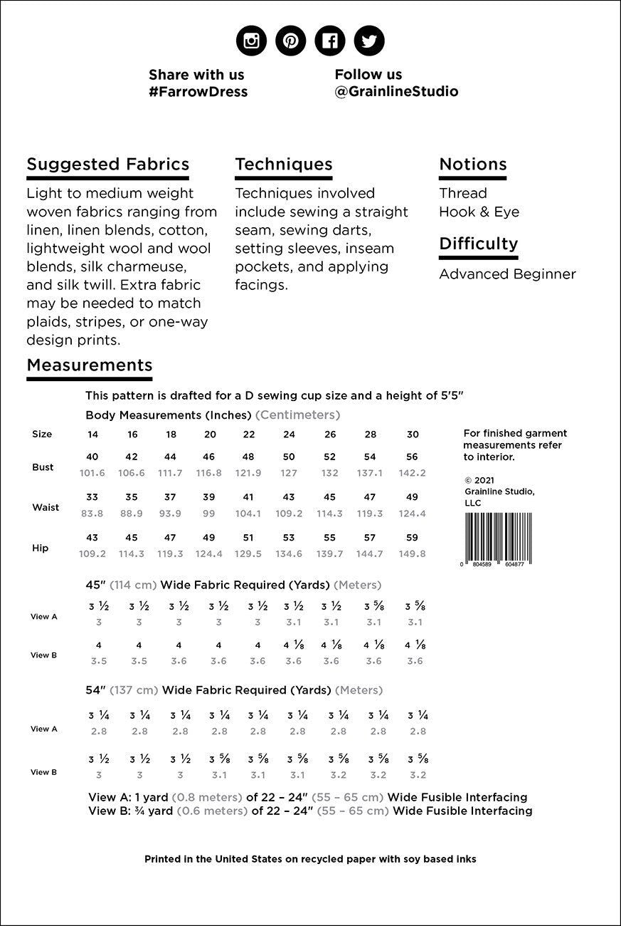 The Farrow features an elegant A-line shape set off by a jewel neckline. Clever diagonal seaming adds interest and conceals inseam pockets. The option of making the Farrow sleeveless or using the bracelet length sleeves gives it year-round versatility. Techniques involved include sewing a straight seam, sewing darts, setting sleeves, inseam pockets, and applying facings.