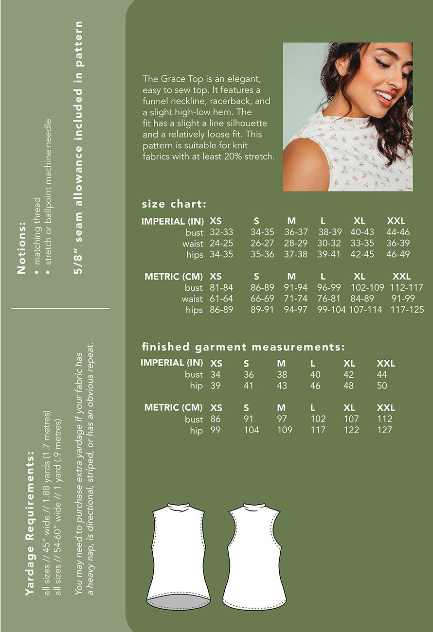The Grace Top is an elegant, easy to sew top. It features a funnel neckline, racerback, and a slight high-low hem. The fit has a slight a line silhouette and a relatively loose fit. This pattern is suitable for knit fabrics with at least 25% stretch.