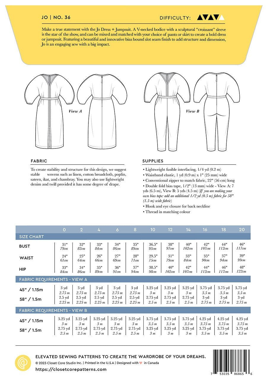 Make a true statement with the Jo Dress + Jumpsuit. A V-necked bodice with a sculptural “croissant” sleeve is the star of the show and can be mixed and matched with your choice of pants or skirt to create a bold dress or jumpsuit. Featuring a beautiful and innovative bias-bound slot seam finish to add structure and dimension, Jo is an engaging sew with a big impact. The bodice for both views features a rounded, cut-on sleeve — choose between the large sleeve with an exaggerated rounded shape, or the small sleeve with a less dramatic silhouette. The bodice is shaped with darts in the front and a comfortable elastic waist in the back, and the neckline and outer sleeve seams are finished with our unique slot seam finish. Both views are finished with a traditional zipper and fabric zipper pull to make it easy to get on and off. View A is a dress with a midi-length straight-cut skirt, front darts, a bias-bound center slit, and curved front pockets. View B is a jumpsuit with a tapered leg, front darts, and curved front pockets.