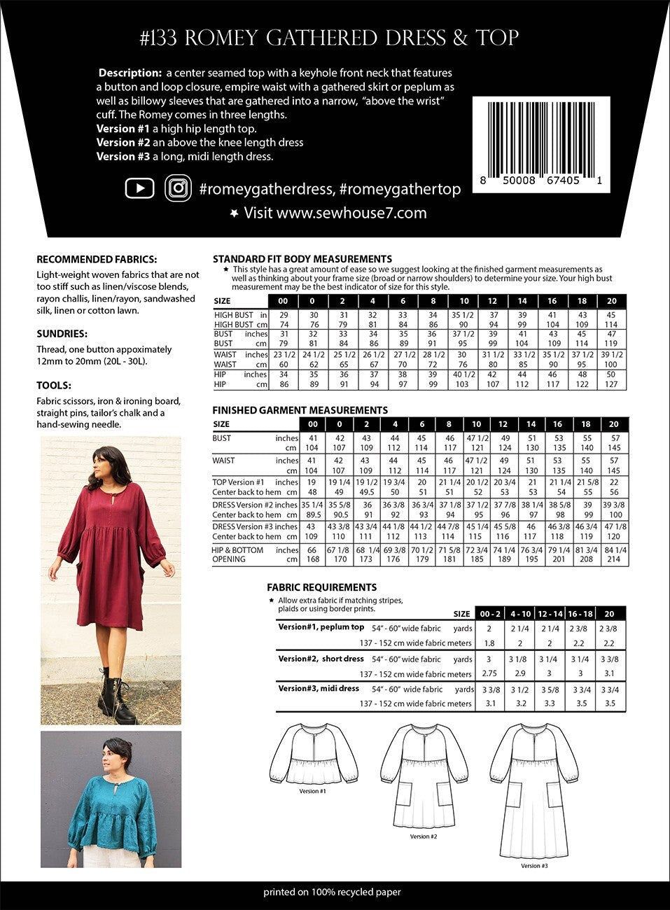 The Romey Gathered Dress & Top pattern is inspired by our beloved Remy Raglan pattern. Beginning with the signature (Version #2) Remy keyhole neckline and loose fit, we shortened the waistline into an elegant empire waist with a gathered skirt or peplum and billowy gathered sleeves at bracelet length. Both dress versions include patch pockets because our customers love pockets. With its flowy and oversized fit, we would classify the Romey Gathered Dress and Top as secret pajamas that can be worn casually with sneakers, sandals or boots. Sew one up in a slinkier fabric for a more polished look!