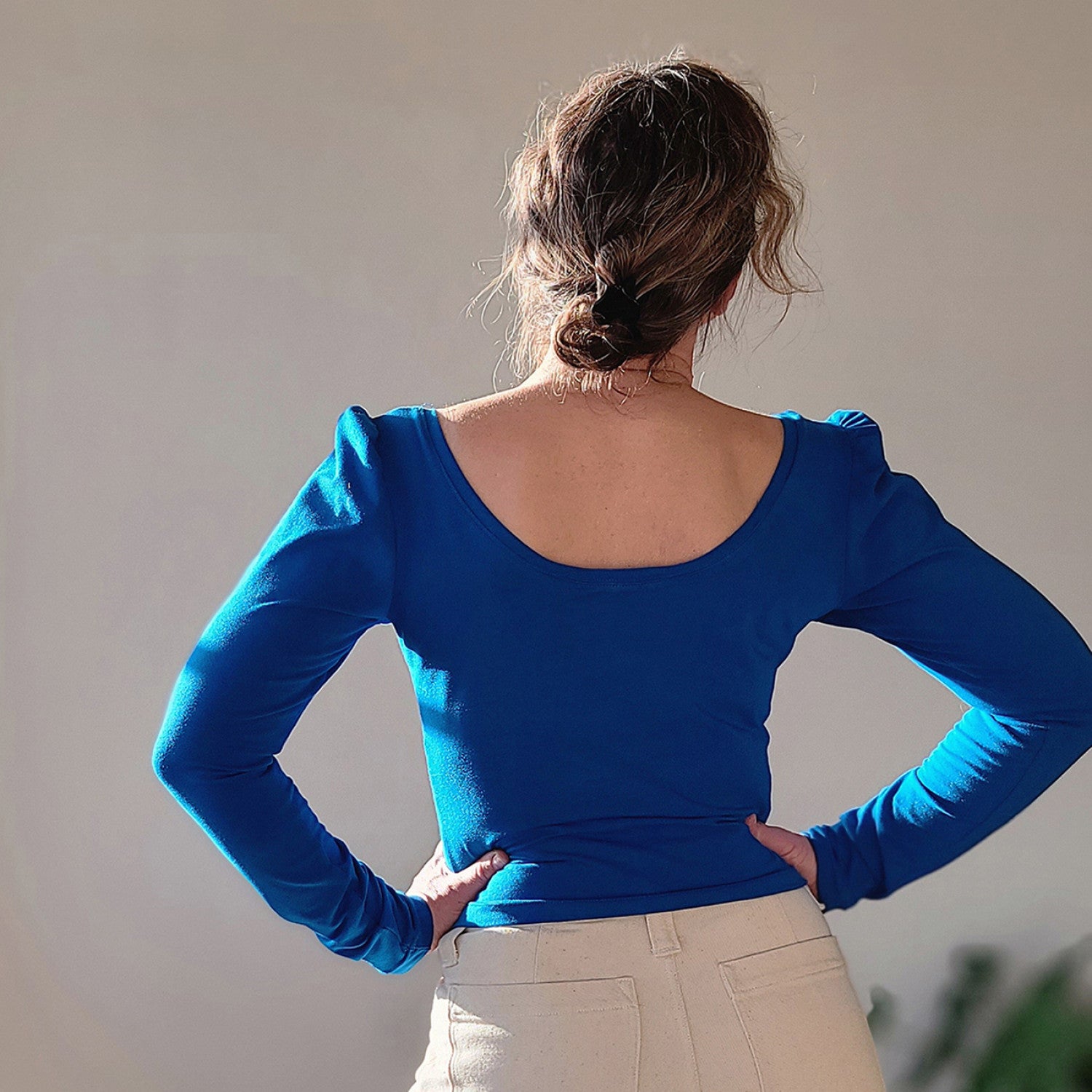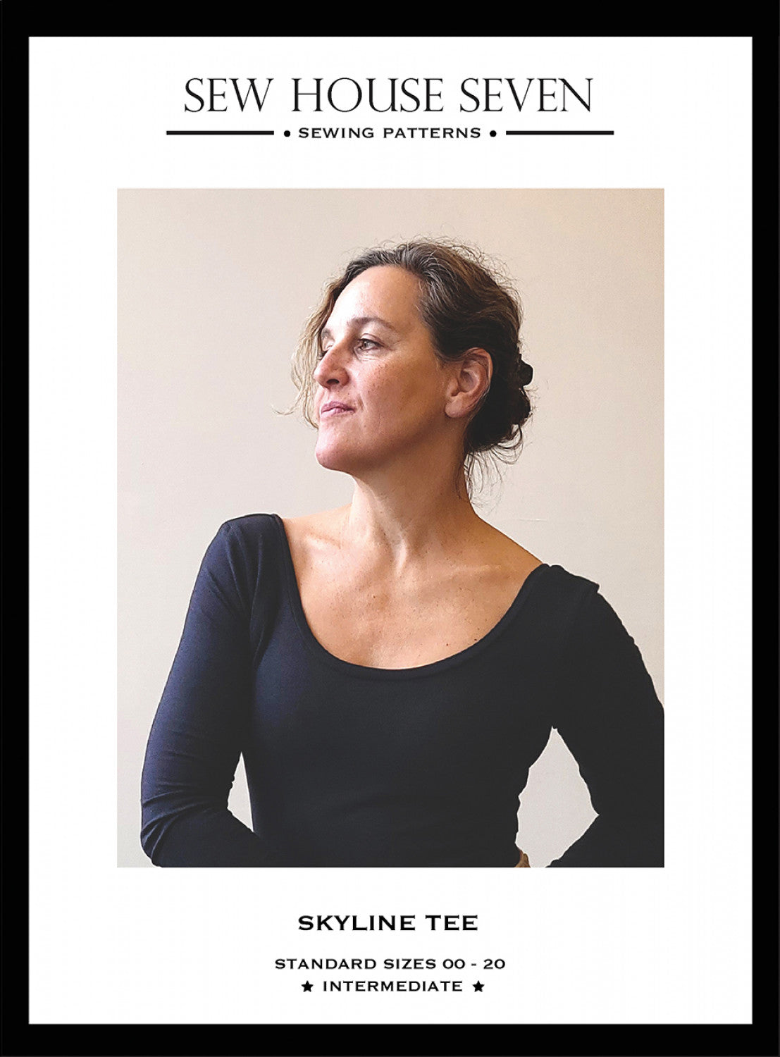 Sewing Pattern - The Skyline Tee (sizes 00-20) is a classic, fitted, body-con t-shirt designed for stretch knits. There are five different necklines to choose from - a low scoop front, a low scoop back, a high back, a jewel neck or two V-neck variations. There are four different sleeve options - a long slim sleeve, an elbow length slim sleeve, a gathered long sleeve and a cap sleeve. There are two hem lengths - hip length and cropped. Make a t-shirt for every season.