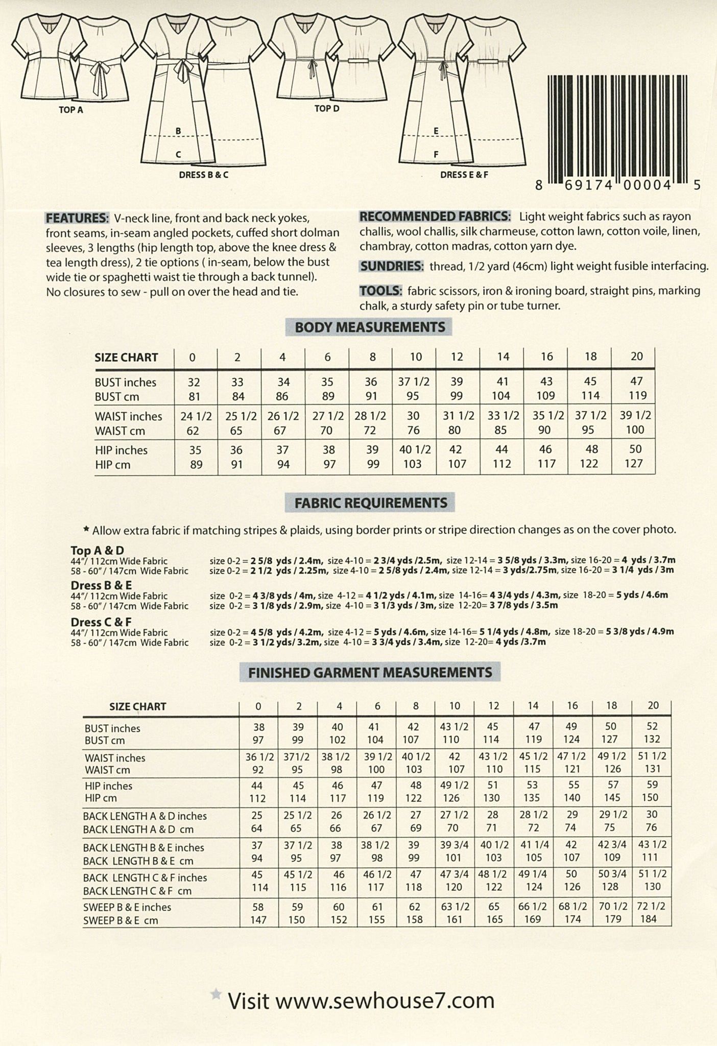 Flattering and easy to wear, the Tea House is a great pattern with a variety of options for different looks. Use a silk or rayon fabric with some drape for a vintage inspired look while a cotton yarn dyed stripe can lend a more modern feel. The Tea House features: a V-neckline with front and back neck yokes, front seaming, in-seam angled pockets (for the dress versions), a back neck box pleat, cuffed dolman short sleeves and two different tie options. Views A, B, & C feature wide under the bust, inseam ties that can be tied behind the back or doubled around to the front. Views D, E & F feature a spaghetti waist tie that threads through a back tunnel and can be tied in the front or for just a bit of waist definition - tied behind the back. There are three different length options - views A & D are hip length tops, views B & E are above the knee length dresses and views C & F are tea length dresses. There are no closures to sew - just slip it on over the head and tie!