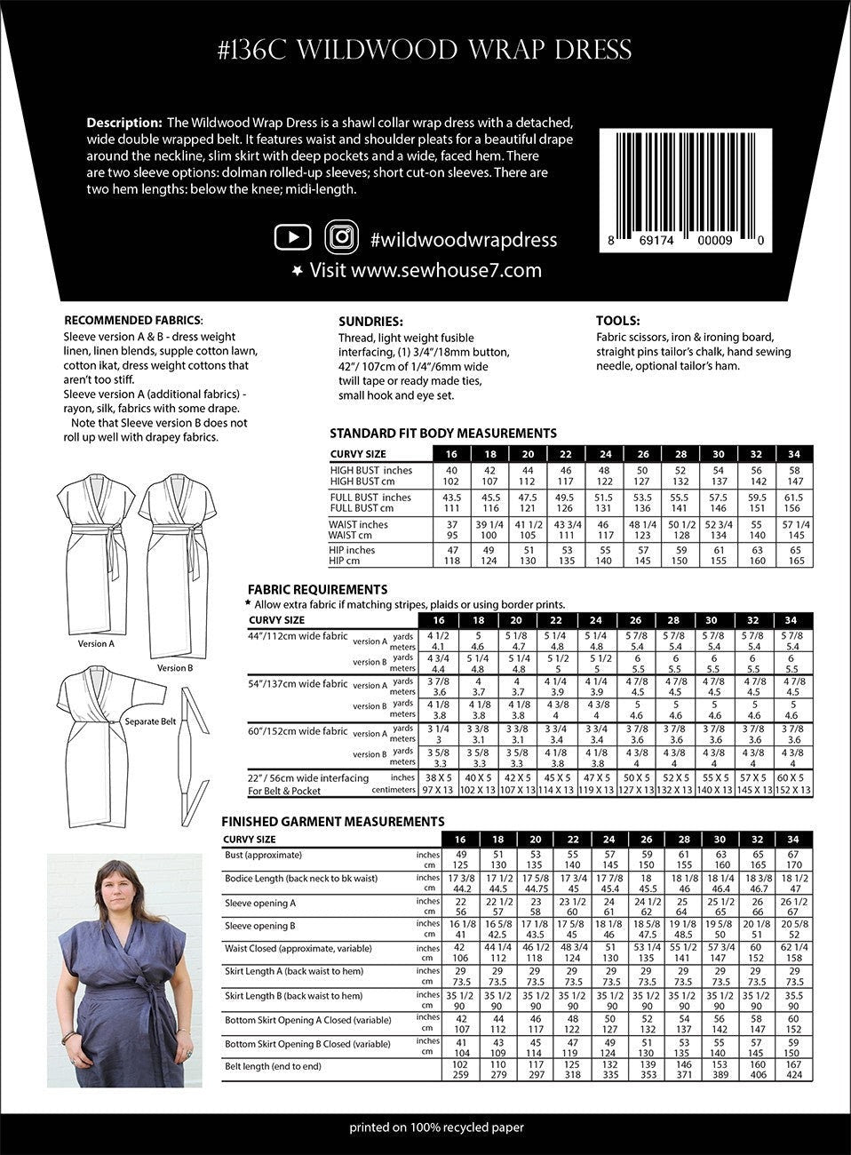 The Wildwood Wrap Dress is a shawl collar wrap dress with a detached, obi-inspired belt. It features waist and shoulder pleats for a dreamy drape around the neckline, a slim sirt with deep pockets and a wide, faced hem. There are two sleeve options - dolman rolled-up sleeves or short cut-on sleeves. There are also two hem lengths - below the knee and midi-length. Intermediate level. Curvy Sizes 16 - 34.