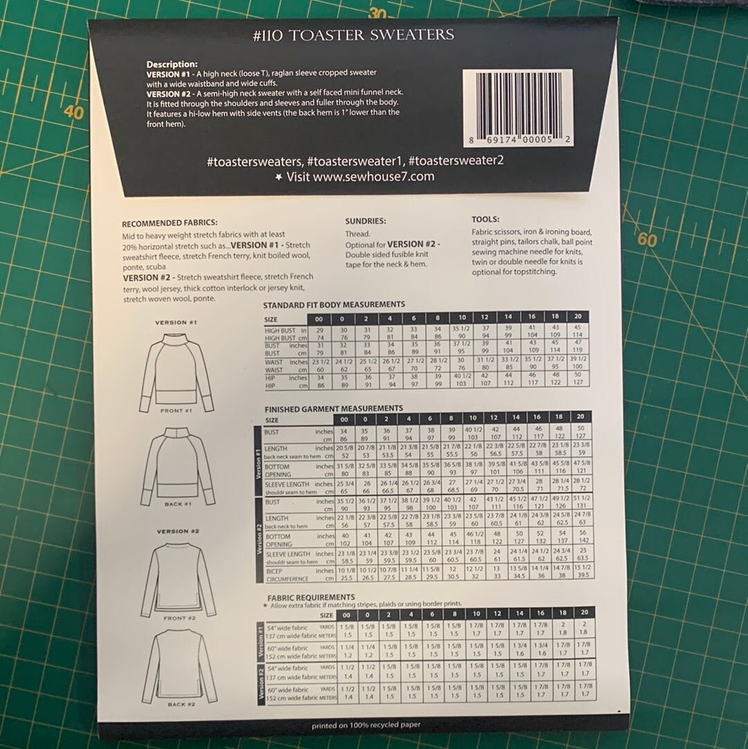 The Toaster Sweaters consist of two different high neck top designs to keep you toasty warm and stylish in the cooler months. They are both very simple to sew and perfect for sewists of all levels who want to try their hand at sewing knits. These sweaters are designed to be constructed using knit fabric with at least 20 percent stretch around the width of the body.Sweater 1 is a closer fitting, semi cropped sweatshirt or sweater. It works best when sewn in thick, stiff knits with some body to keep the neck standing upright. It features raglan sleeves, a wide waistband, a loose turtleneck, long cuffs and falls between the high and low hip. It’s great in a standard sweatshirt fleece with stretch however, it’s also extremely handsome in a sweater knit to dress it up a bit.Sweater 2 is an easy top or sweater that can be dressed up or down. It is somewhat fitted through the shoulders and sleeves and then swings out a bit at the underarms and hem. It features a semi high neck that takes its inspiration from funnel and boat necks. It also has side vents with a hi low hem. The front hem falls just below the high hip. Sew it in a boiled wool knit, a wool jersey or ponte for a more dressed up look. Sew it in a sweatshirt fleece with stretch or jersey knit for a more casual look.This is a beginner level pattern. Sizes XS through XXL