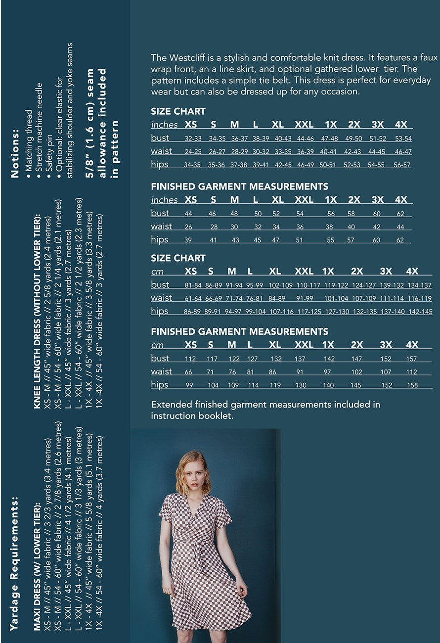 The Westcliff Dress is an easy to sew dress for knit fabrics. It features a wrap front with full coverage and a neckline that won’t gape! There is an optional lower tier that makes this dress a maxi. The pattern also includes a tutorial on how to turn this dress into a cute cropped top.